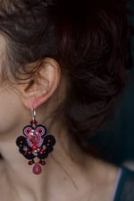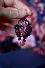 "Black & Berries" est une paire de boucles aux allures d'un intrigant papillon de nuit sans en épouser parfaitement les formes. Son précieux coeur de cristal Swarovski révèle une discrète lumière Burgundy au centre d'une broderie subtilement monochrome.