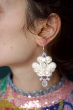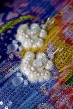 Ces boucles ont été délicatement brodées à l'aiguille selon plusieurs minutieuses techniques de broderie d'art. Et si la passementerie française structure le design de ce bijou, elle se plait à revêtir les doux reflets de perles nacrées signées Swarovski, de régulières rocailles japonaises, perles de verre tchèques et toupies de cristal Swarovski.